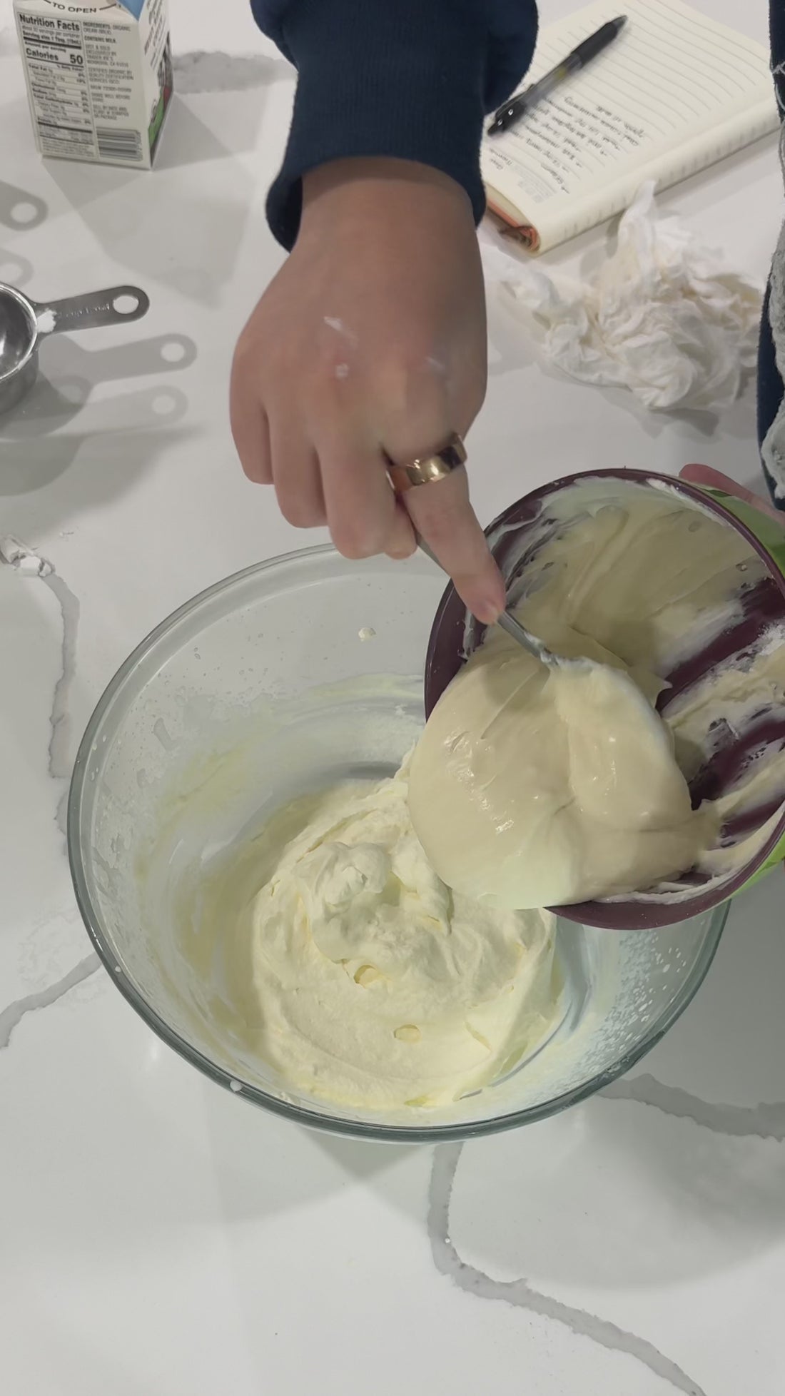 In a chilled bowl, whip 3/4 cup of heavy cream until light and fluffy. Watch the Peaks! Be careful not to over-mix! You want soft-to-medium peaks. Set this aside.
